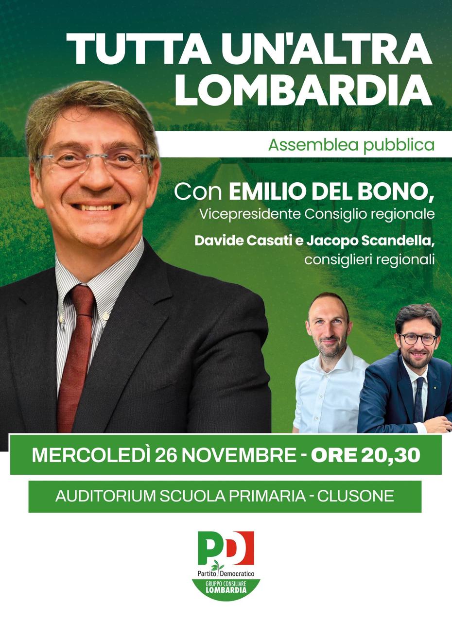 Mercoledì 26 novembre 2025 – ore 20:30 Auditorium Scuola Primaria – Via Roma, 11, Clusone Il Partito Democratico della Lombardia invita…