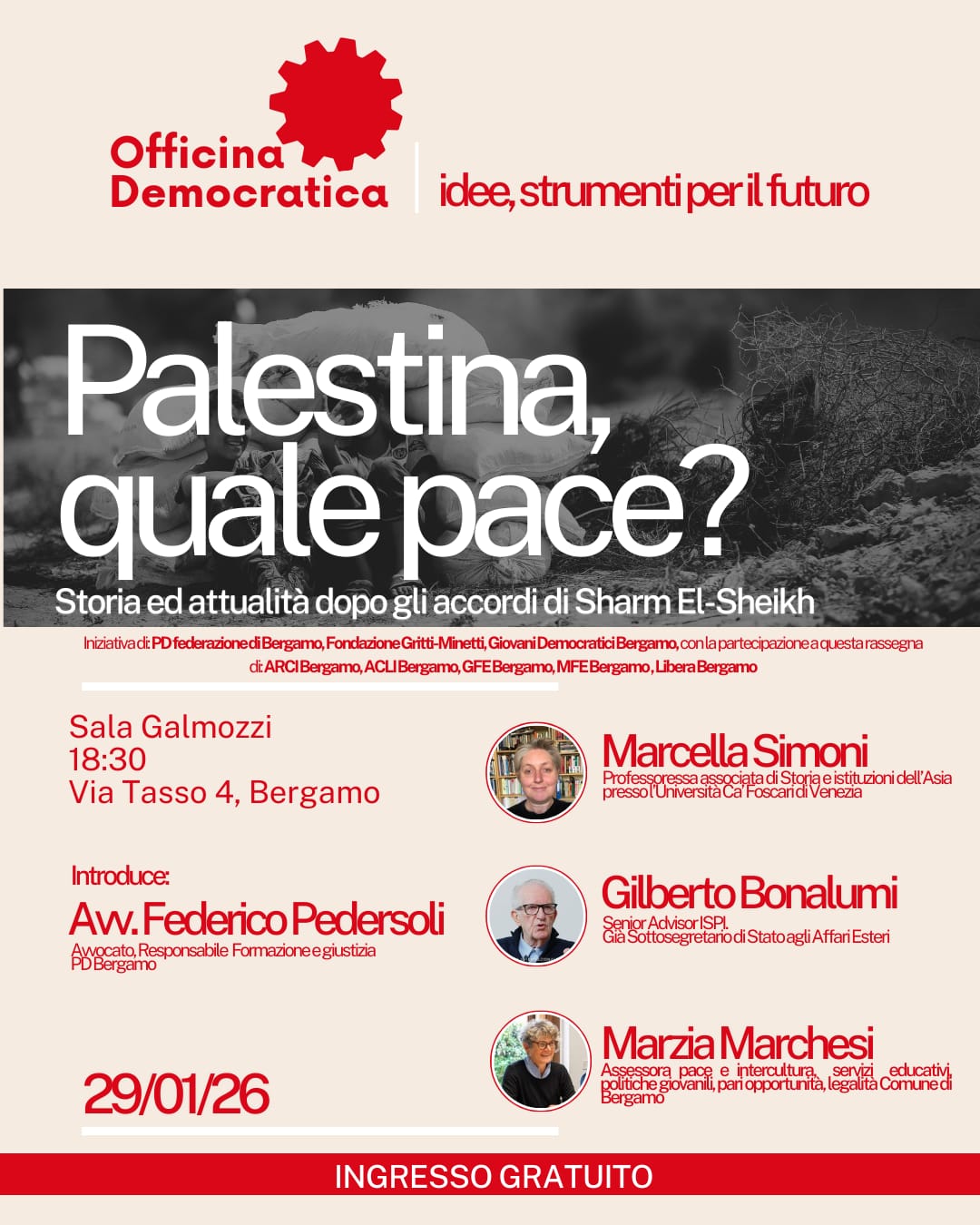 Palestina, quale pace? Data: 29 gennaio 2026 Tema: Storia e attualità dopo gli accordi di Sharm El-Sheikh Luogo: Sala Galmozzi, Via Tasso 4…